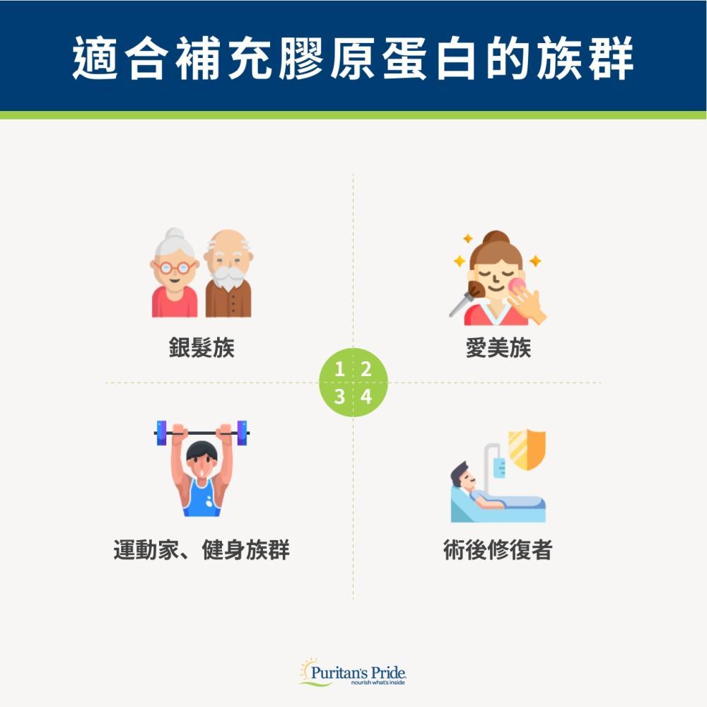 • 運動家、健身族群:適當地補充膠原蛋白可以支持結締組織的健康和修復,同時,也對於提高運動表現、減少運動損傷以及促進運動後恢復有益。